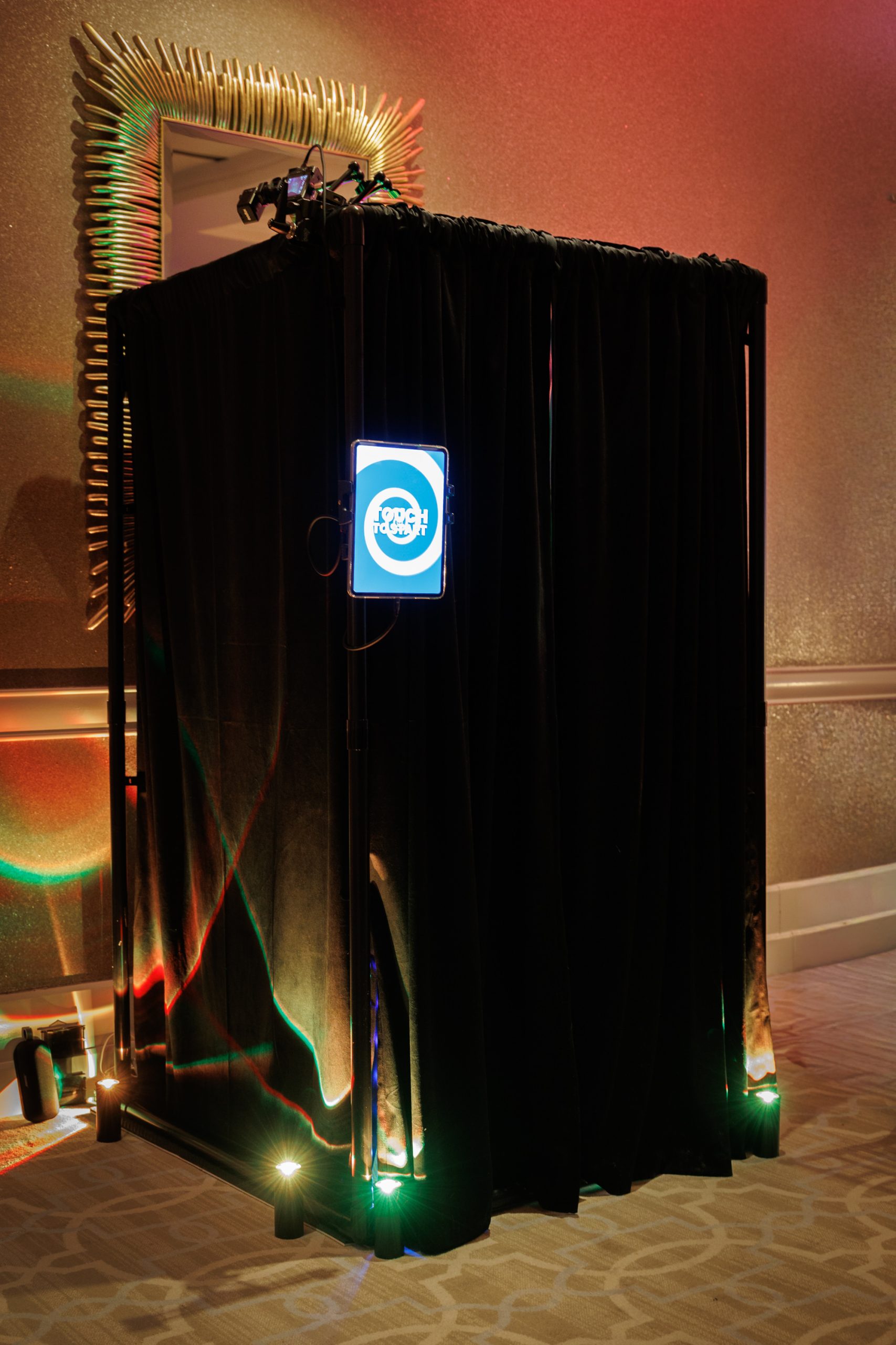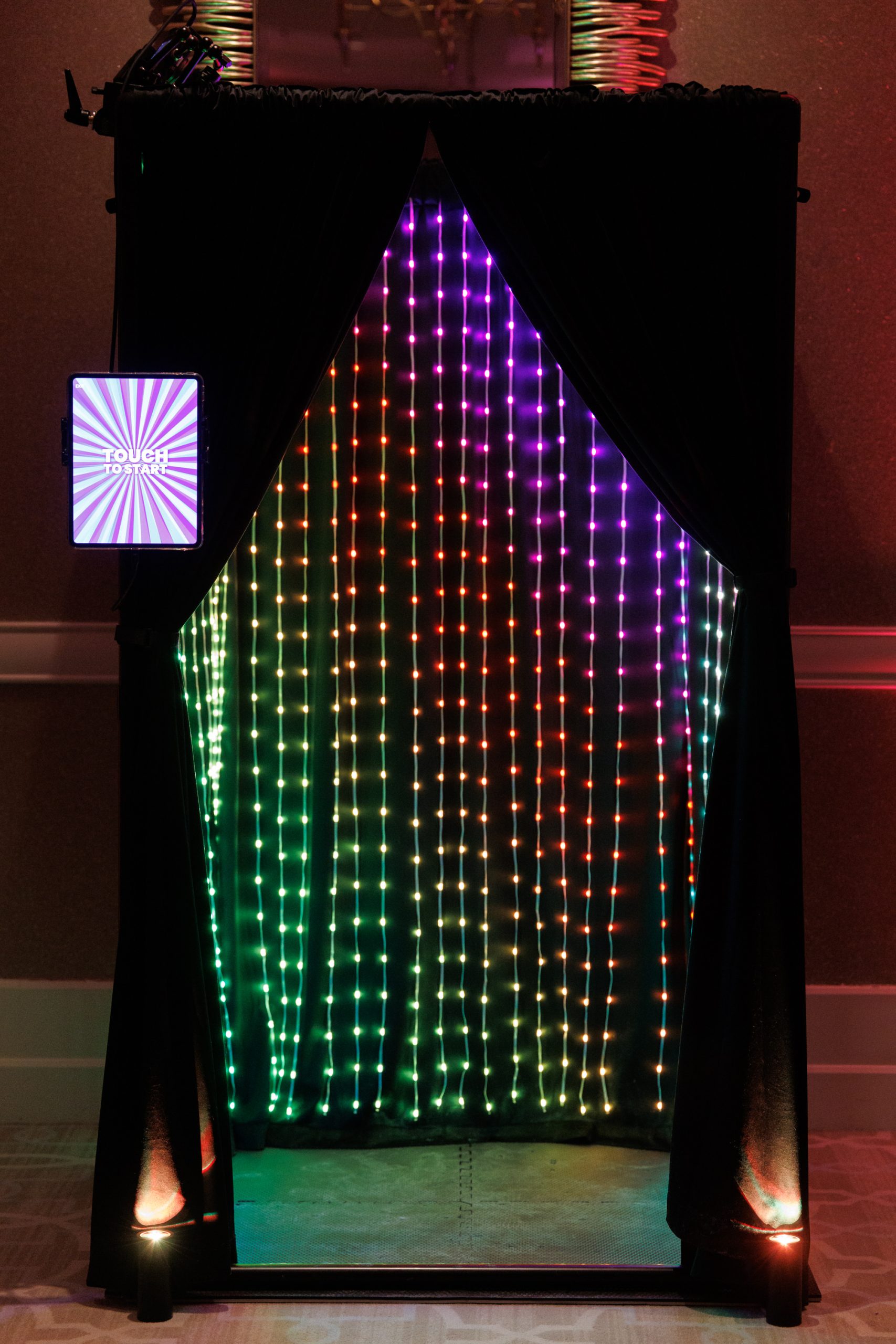 The POD is the same enclosrure we use for our Birds-Eye Booth. She is slightly larger than 5’x5′ with black velet drape and LED Curtain Lights inside. Optional color up-lighting is available.